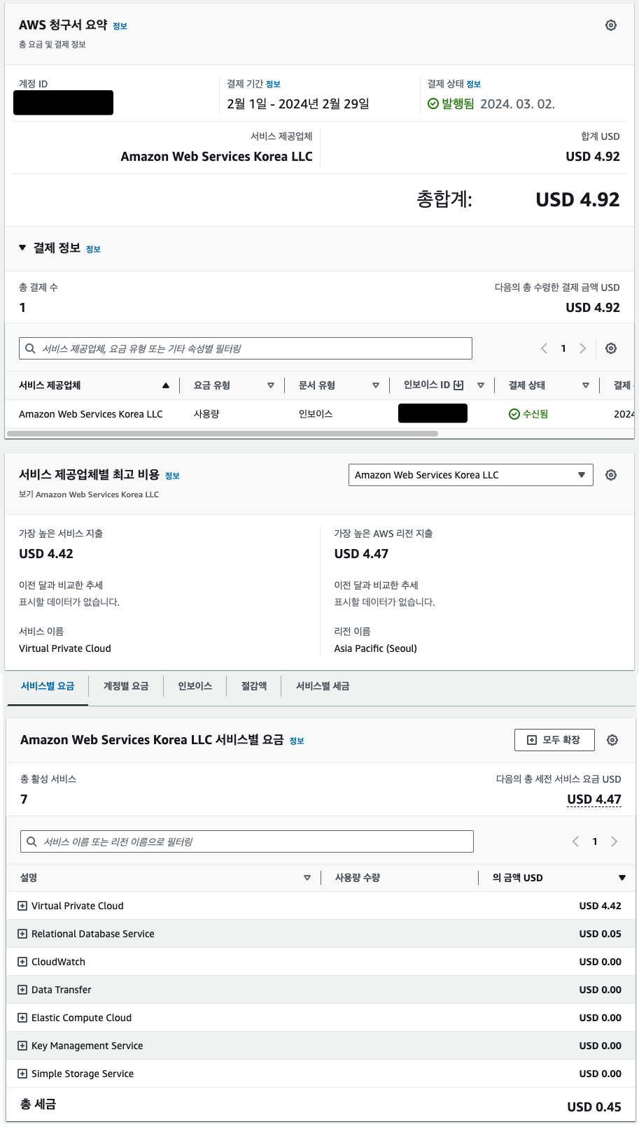 - 2024년01월에 개인 프로젝트를 위해 AWS를 사용했고, 예상하지 못한 금액이 청구됨을 확인했습니다.