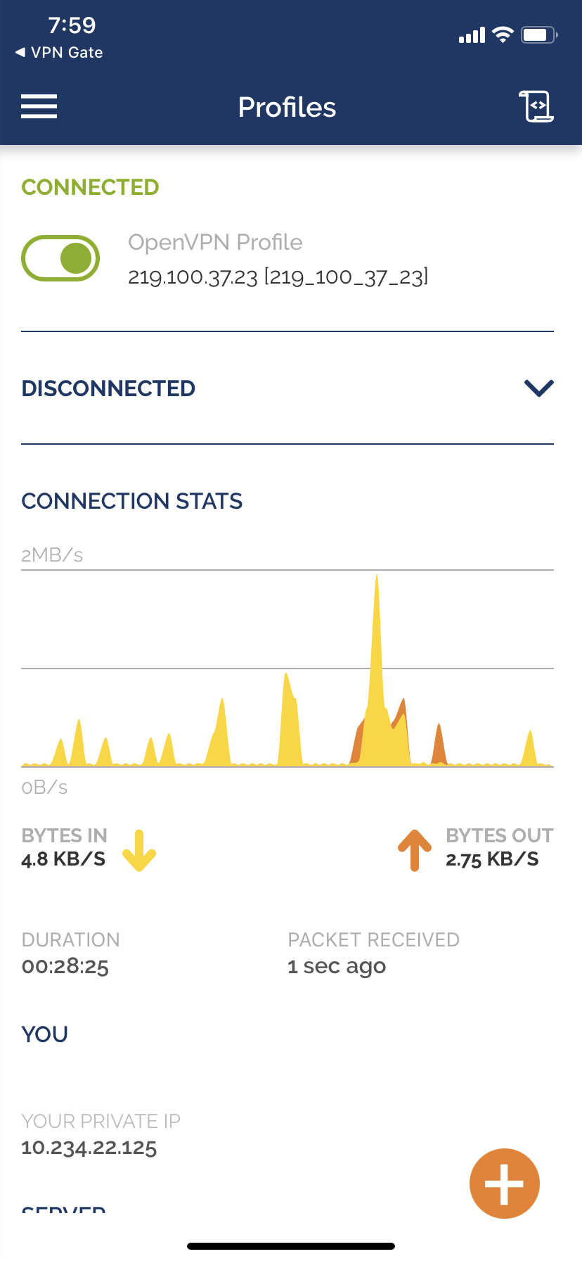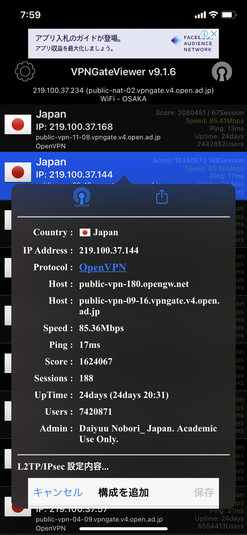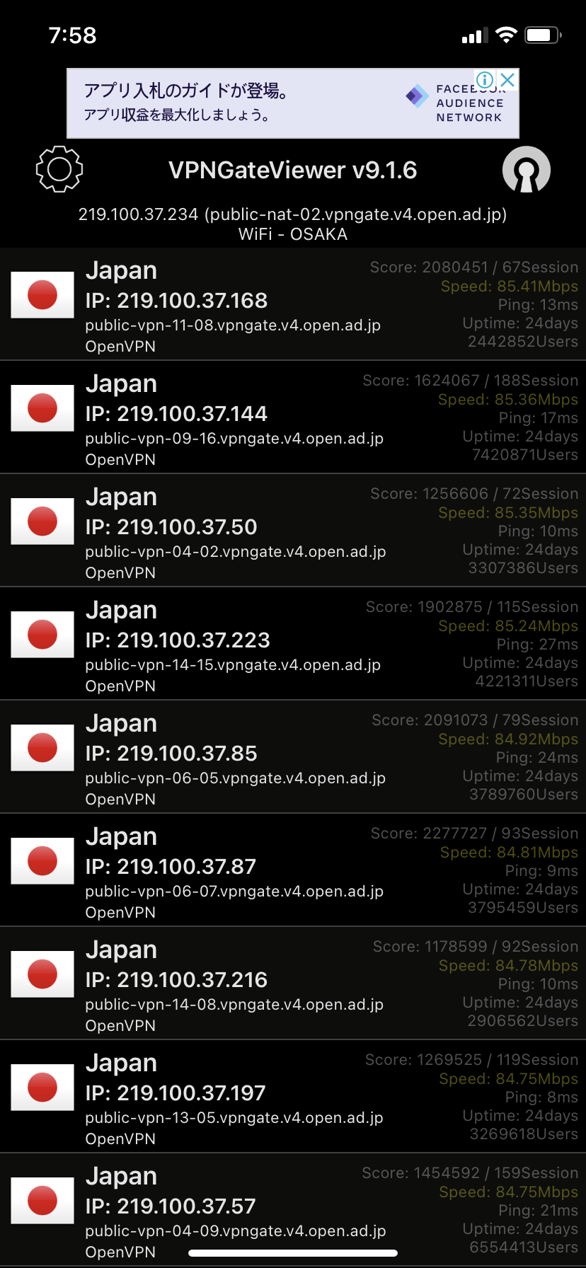 [2-VPN Gate 앱을 실행하여 원하는 국가와 ip를 선택한다.]