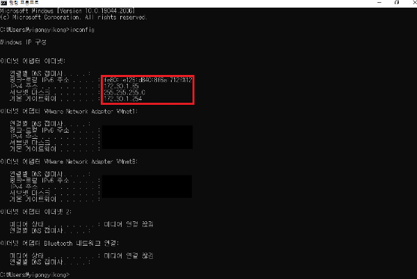 [2]에서 확인한 공인 'ip'와 'cmd-명령 프롬프트'로 'ipconfig'를 통해 설정된 이더넷 'ip'가 동일함을 확인한다.