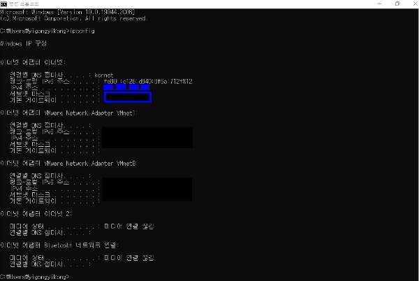 [2]에서 확인한 공인 'ip'와 'cmd-명령 프롬프트'로 'ipconfig'를 통해 설정된 이더넷 'ip'가 다르다.