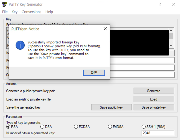 [08_PuTTYgen에서 id_rsa를 Load 에 성공하면, 아래와 같이 팝업이 나오고, 먼저 확인 버튼을 클릭한 후, Save private key 버튼을 클릭한다.]