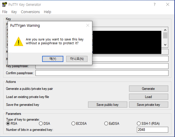 [09_PuTTYgen에서 private key 저장에 대한 Warning 팝업에 "예" 버튼을 클릭하고, ppk 파일을 저장한다.]