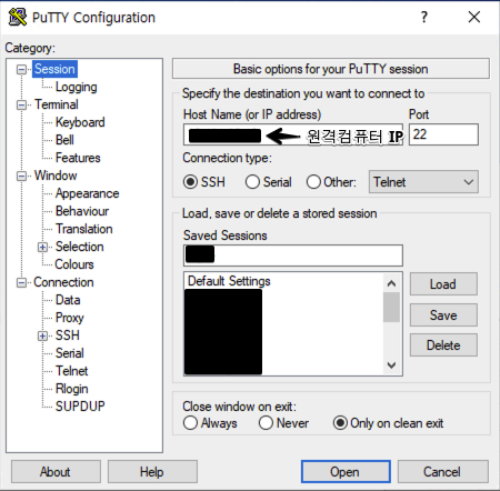 [11_다시 PuTTY를 열고, 원격컴퓨터 IP를 입력한다.]