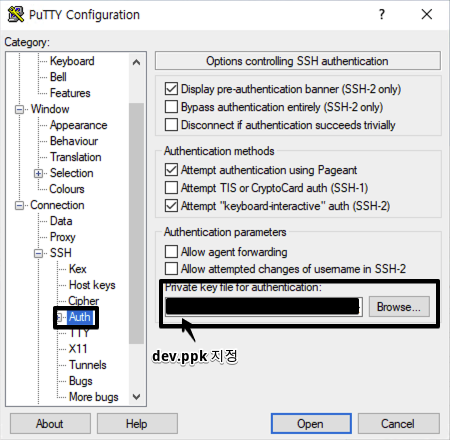 [13_Category > Connection > SSH > Auth에 들어가 생성한 ppk 파일을 지정한다.]
