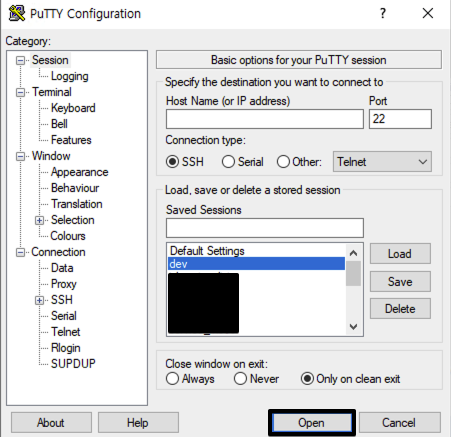 [15_저장한 Session을 선택하고 Open 버튼을 클릭하면, 자동 로그인된다.]